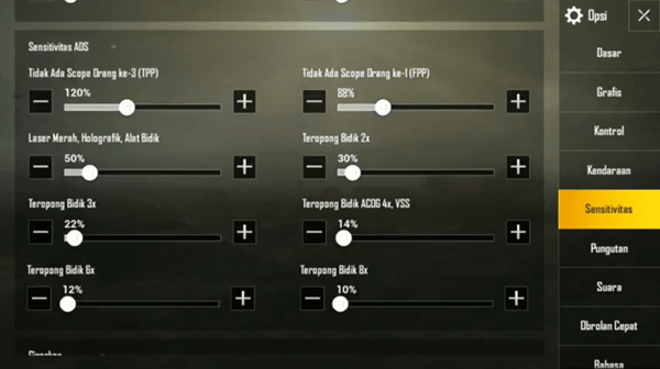 Pengaturan berikutnya yang harus Kamu lakukan adalah pada sensitivitas kamera, gyrocope, dan ADS. Ketiga hal tersebut tentu sangat penting agar akurasi tembakan dan serangan Kamu menjadi lebih akurat.