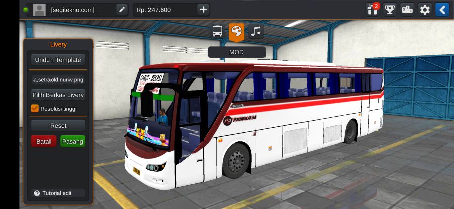 Ini di beberapa livery Bus Primajasa yang bisa kalian pasang untuk bus asli yang sudah disediakan game Bus Simulator Indonesia di toko in game. Livery bisa kalian pasang dengan masuk ke menu Garasi > Palet > Resolusi tinggi > Pilih Berkas Livery > Galeri Perangkat.